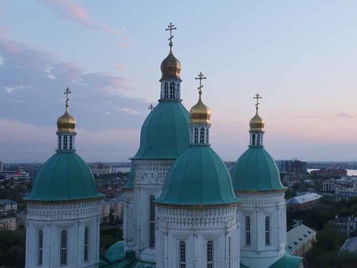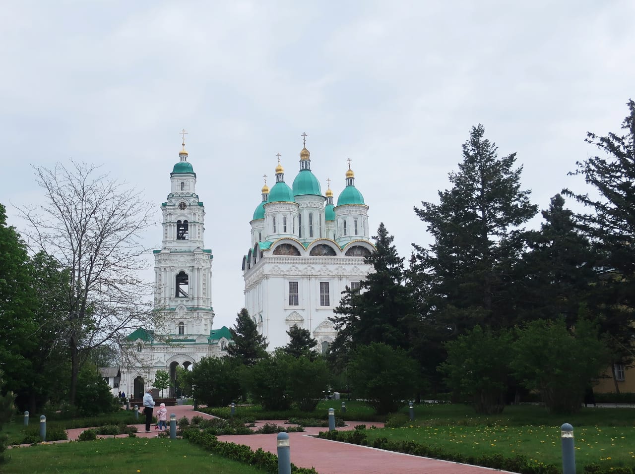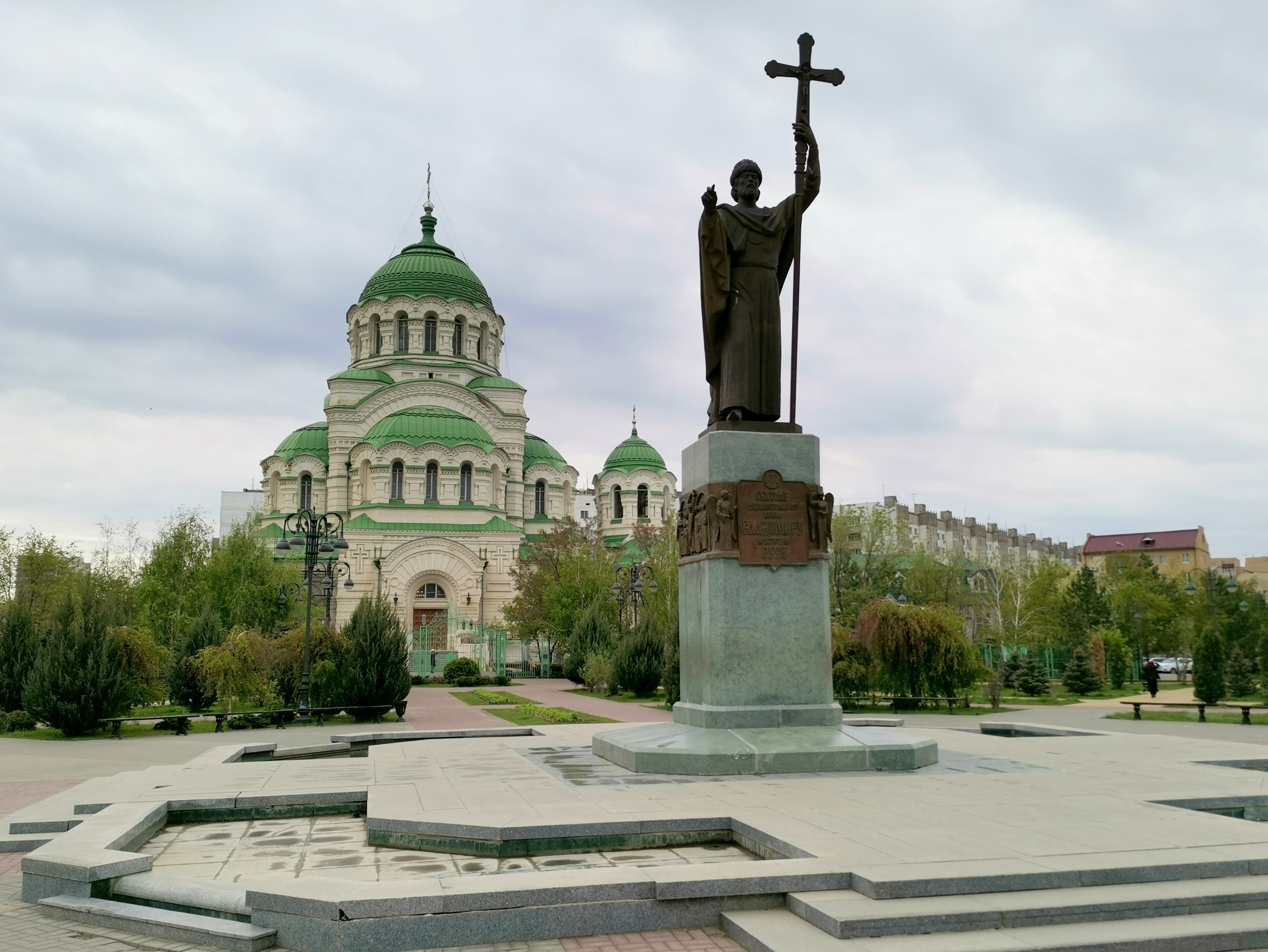Владимирский кафедральный собор строился на месте татарского кладбища и на деньги, собранные с мусульман. Да ещё и памятник Крестителю Руси они тут же выстроили. Что сказать - астраханская веротерпимость и религиозная взаимопомощь.