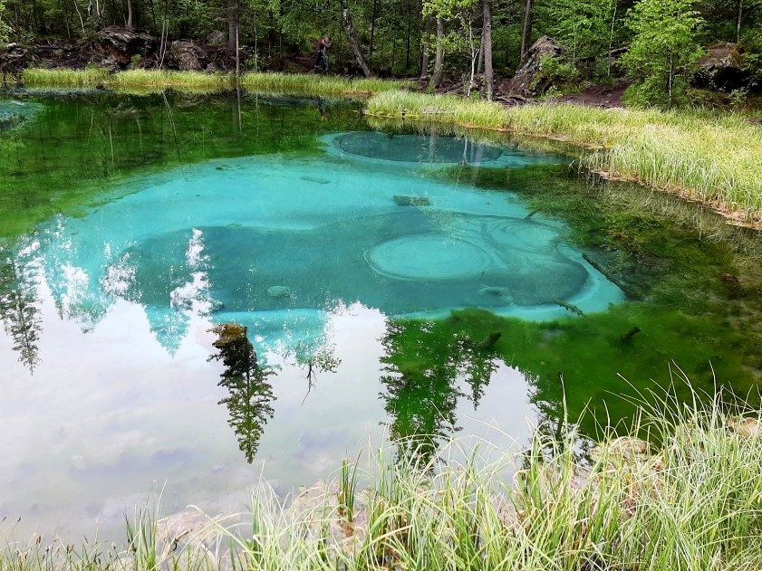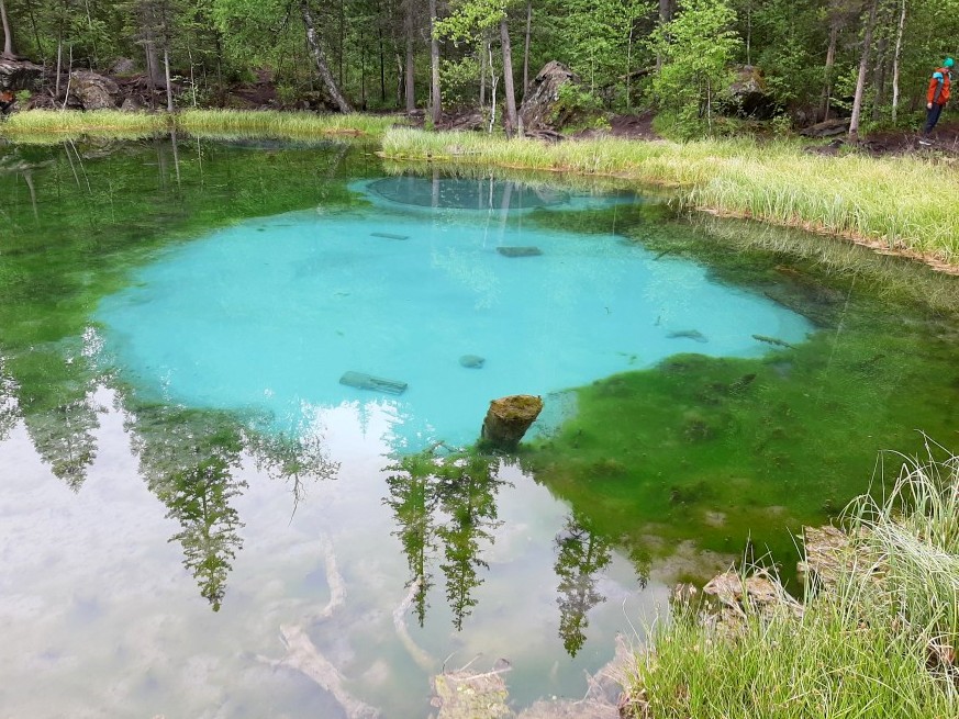 Озеро очень прозрачное, деревяшки на дне видны отлично. А теперь смотрим внимательно и сравниваем со следующим фото. Форма лазурных пятен меняется на глазах. Собственно, это и есть главный эффект озера!