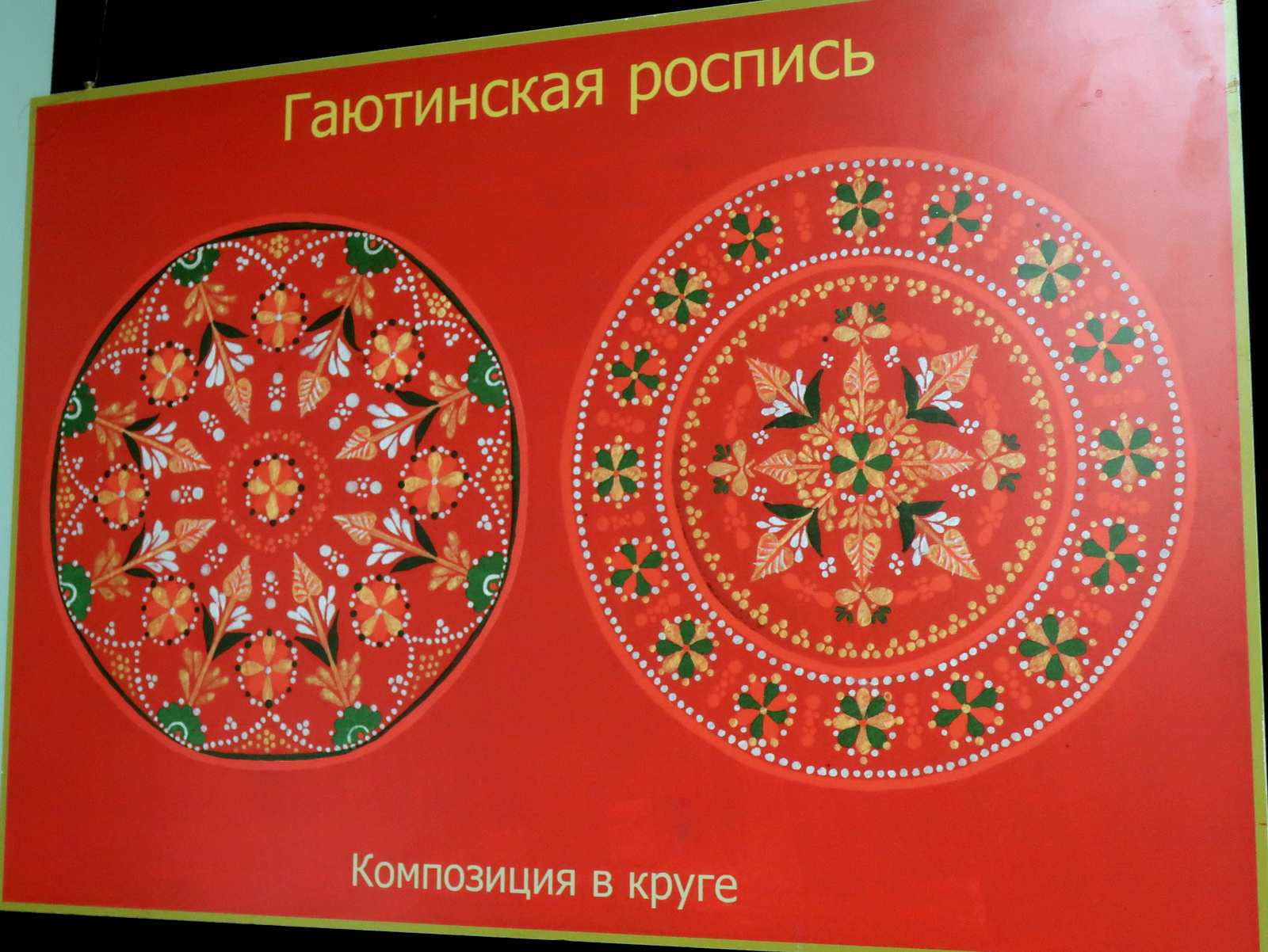 Но творческая активность тут бьет ключем. "Моего мужа направили служить в Гаютино, далеко, жителей осталось здесь немного. А мне чем заняться? Человек-то я активный, сидеть без дела не могу. Устроили на четверть ставки в клуб. Ну и начала я расписывать деревянную посуду в местной манере - "зеленый мох на коасной клюкве. И возродили роспись из пепла" - рассказывает матушка, жена сельского священника. Сегодня гаютинская роспись шагает по городу и миру, привлекая необычайной яркостью красного цвета. На маленьких цветочках считываются не только солнышки, но и образы человека с нимбом и распростертыми руками. Видимо, без христианских образов здесь не обошлось.