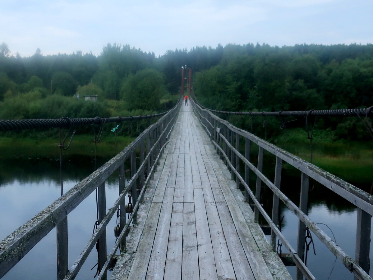 Отпускаем бабушек и идём смотреть село. Удивительно, но вокруг чистые крашеные домики, красивый подвесной мост через Устью, каменный магазинчик с велосипедом у входа, аккуратная деревянная школа. В ней осталось 24 учеников, да 7 детей в садике. Но вот библиотека работает, а у нее - раскрашенный туалет с восклицающим волком "Ты это, заходи, если че!".