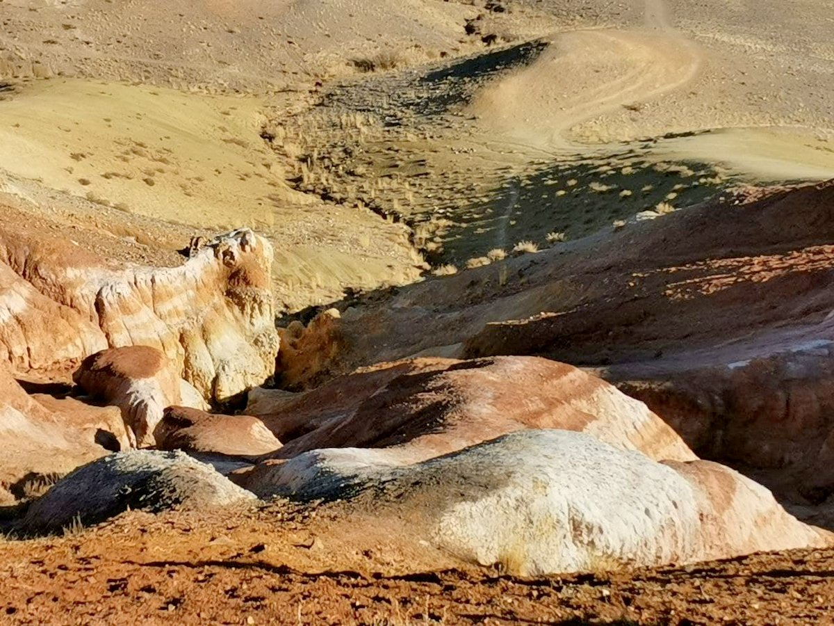 А вот следующий по курсу «Марс» - как бы оппонирует своей статичностью. Урочище Кызыл-Чин славится неземными пейзажами. Горные породы тут обнажаются своим безжизненным разноцветьем. Отсюда и народные названия - Марс-1 (красный каньон), Марс-2 (радужные горы серого, желтого, красного, фиолетового цветов), Луна (горы белоснежной глины). За рамками летнего сезона (когда поток «космонавтов» спадает) здесь можно вдоволь побродить отреченным от земных забот, если загрустишь по Земле - так кажущийся орбитальной станцией гремпинг быстро о ней напомнит.