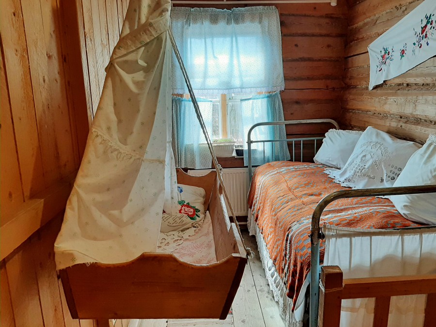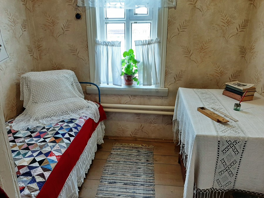 В деревянном домике в Гжатске Юра Гагарин прожил 4 года, уехал отсюда в 15 лет, чтобы начать самостоятельную жизнь, а в новый каменный дом приезжал к родителям в гости, здесь его ждала комната.