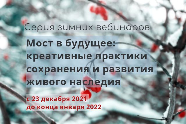 Декабрь и январь - это не только время праздников, но и время для творческого развития и накопления потенциала для рывка вперёд в 2022 году. Самое время изучить креативные практики и, сохраняя наследие, изобретать новое! Платформа "Живое наследие" открывает цикл вебинаров, посвящённых преображению нашей культурной среды, запуску креативных индустрий и развитию креативной экономики на фундаменте традиции. Регистрируйтесь по ссылке и подключайтесь к нашим вебинарам каждую неделю (время в расписании московское)! Вебинары пройдут на платформе Zoom, ссылки на них будут высланы зарегистрированным участникам за час до начала каждого вебинара. Ссылки на видеозаписи вебинаров будут рассылаться зарегистрированным участникам.