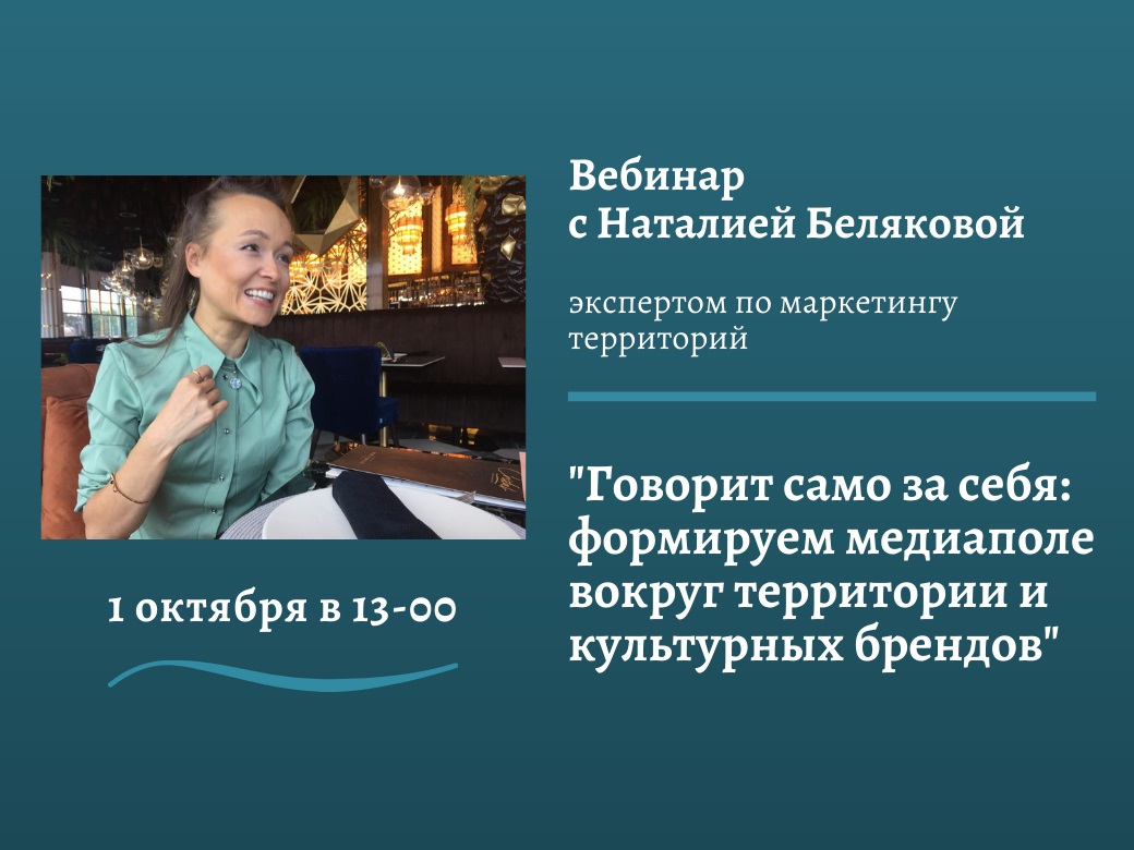 1 октября в 13-00 приглашаем на вебинар известного эксперта по маркетингу территории Наталии Беляковой «Говорит само за себя: формируем медиаполе территории и культурных брендов».