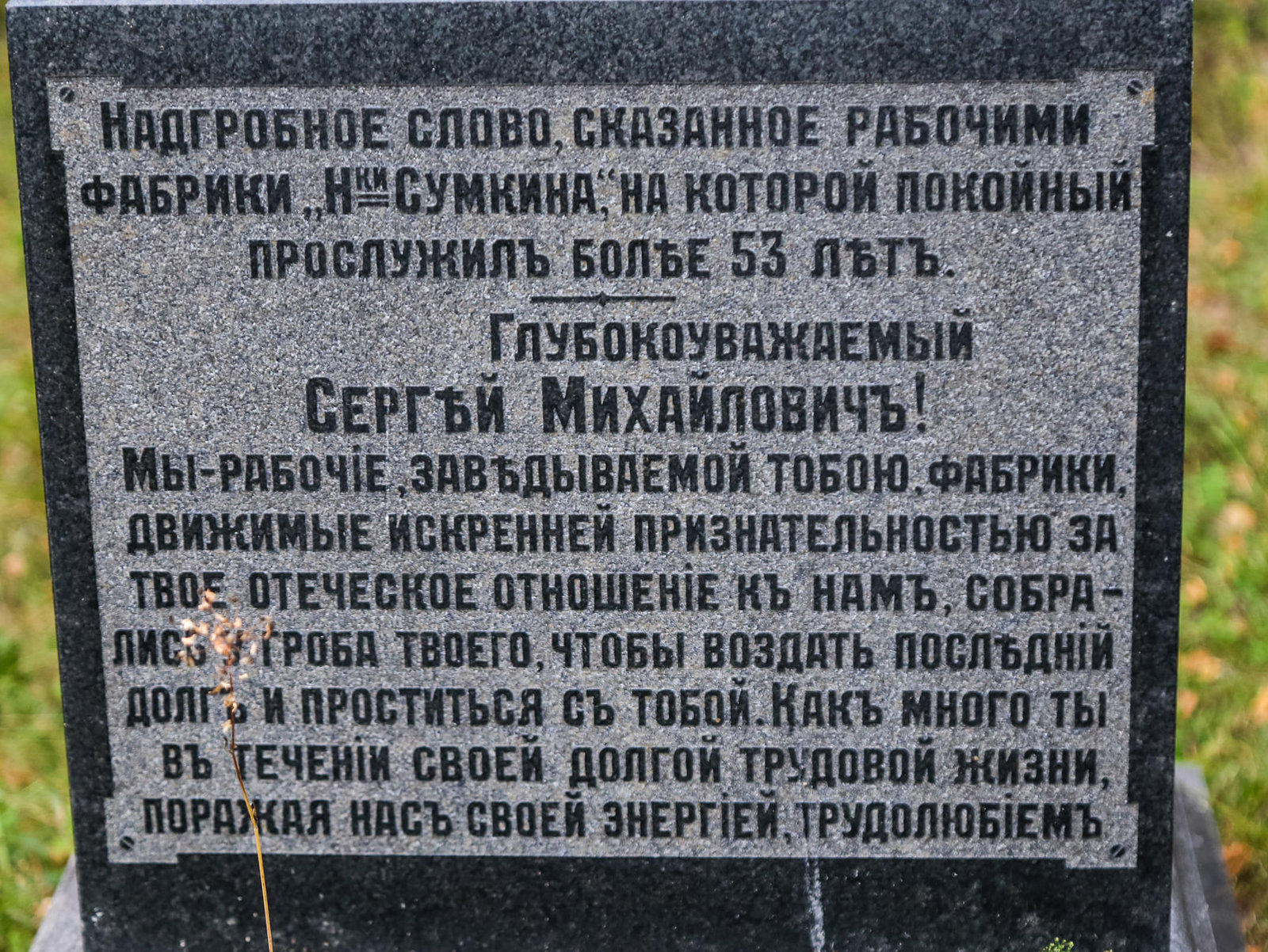 К истории фабрики, да и всего города мы вернемся еще раз, прогуливаясь по удивительному старинному кладбищу Лальска. Мы увидели красивое надгробие, которое рабочие поставили на свои деньги Сергею Михайловичу Прянишникову, бывшему долгое время директором фабрики. Эпитафия, выгравированная на постаменте, произвела неизгладимое впечатление. Там простыми совами смогли высказать свое уважение, благодарность и любовь.